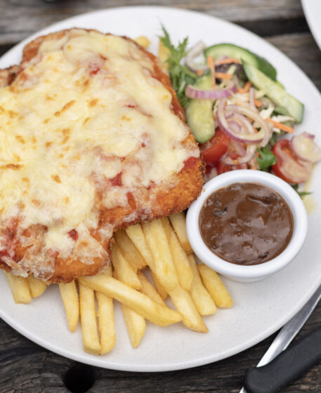 CHICKEN SCHNITZEL / PARMIGIANA — $26/28 SERVED WITH EITHER CHIPS & SALAD OR MASH & VEG AND CHOICE OF CHICKEN (GF), MUSHROOM (V) OR PEPPER GRAVY (V)